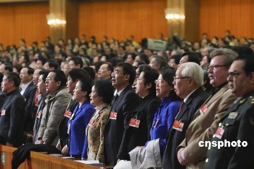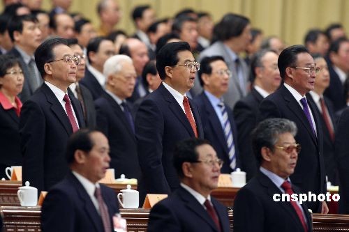 3月12日9時,中國人民政治協商會議第十一屆全國委員會第二次會議在北京人民大會堂舉行閉幕會,全體委員在閉幕式上唱國歌。中新社發 盛佳鵬 攝