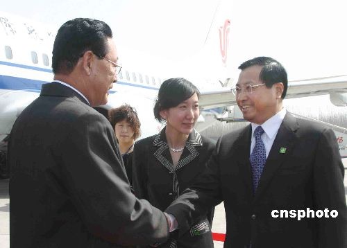 應國務院總理溫家寶的邀請對中國進行正式友好訪問的朝鮮內(nèi)閣總理金英日,三月十七日中午由北京乘機抵達濟南。圖為山東省副省長才利民(右)在濟南國際機場迎接金英日總理。中新社發(fā) 張璐 攝