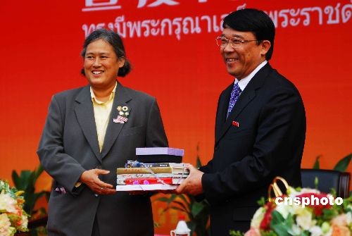 4月7日,泰王國瑪哈扎克里·詩琳通公主殿下和廈門大學(xué)黨委書記朱之文互贈禮品。當(dāng)日,瑪哈扎克里·詩琳通公主殿下出席廈門大學(xué)泰國文化節(jié)開幕式。此次廈門大學(xué)泰國文化是廈門大學(xué)建校88周年紀(jì)念的系列活動(dòng)之一,旨在促進(jìn)中泰文化友好交流。瑪哈扎克里·詩琳通公主殿下在開幕式上用中文致辭,對中泰文化交流予以積極的肯定。中新社發(fā) 周運(yùn)杰 攝