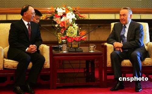 4月16日,中國國家體育總局局長、中國奧委會主席劉鵬在北京釣魚臺國賓館會見哈薩克斯坦總統納扎爾巴耶夫,并向納扎爾巴耶夫總統頒發中國奧委會勛章,以表示其對中國體育事業的支持。納扎爾巴耶夫此行是應中國國家主席胡錦濤邀請,于15日傍晚抵達北京,開始對中國進行為期5天的國事訪問。訪華期間,納扎爾巴耶夫將與中國國家主席胡錦濤、全國人大常委會委員長吳邦國和國務院總理溫家寶進行會見,他還將出席博鰲亞洲論壇2009年年會,這是納扎爾巴耶夫2005年連任總統以來第2次對中國進行國事訪問。中新社發 富田 攝