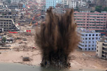 8月11日上午9時40分,蘭州軍區某集團軍“開山斧工兵團”對舟曲堰塞湖堰塞體成功實施第12次爆破。爆破后河道明顯出現斜坡,江水下泄速度明顯加快。圖為堰塞體12次爆破現場。中新社發 劉忠俊 攝