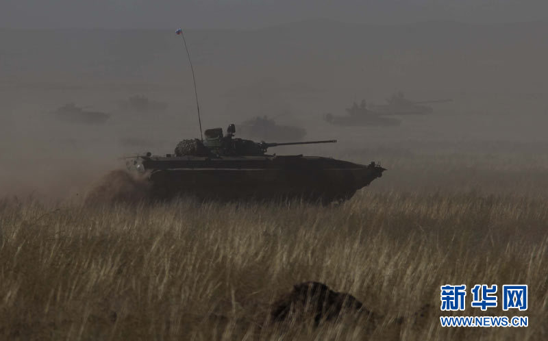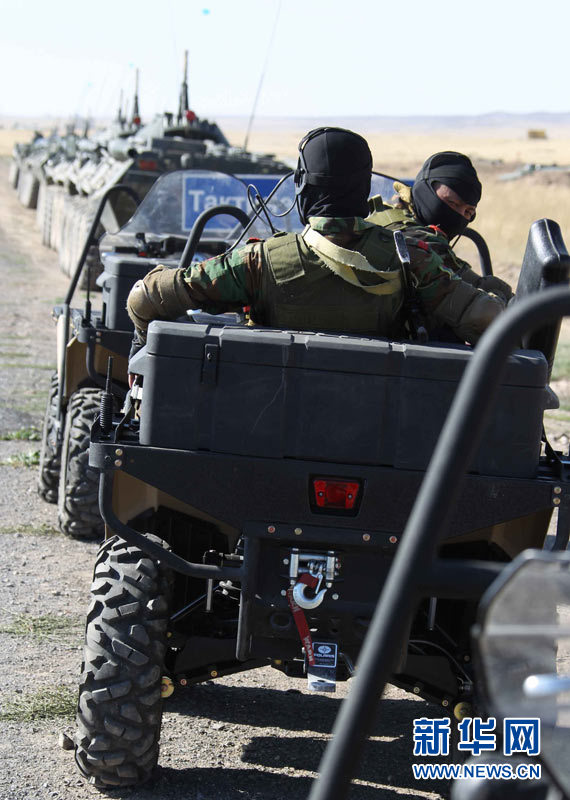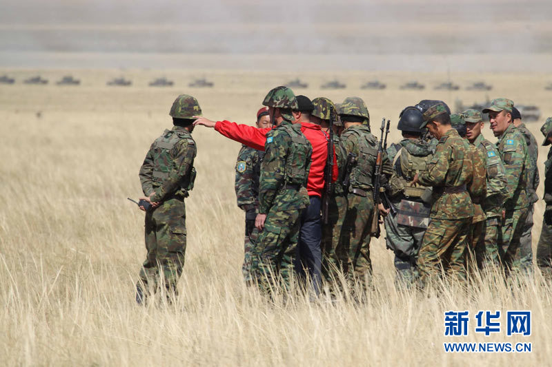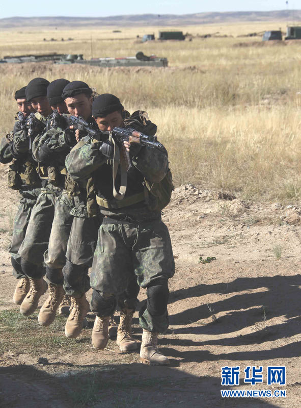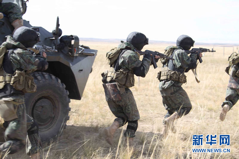 9月15日,參加上海合作組織成員國武裝力量聯合反恐軍事演習的哈薩克斯坦、中國、吉爾吉斯斯坦、俄羅斯、塔吉克斯坦五國參演部隊成功舉行第二次實兵合練。王建民 攝 圖片來源:新華網