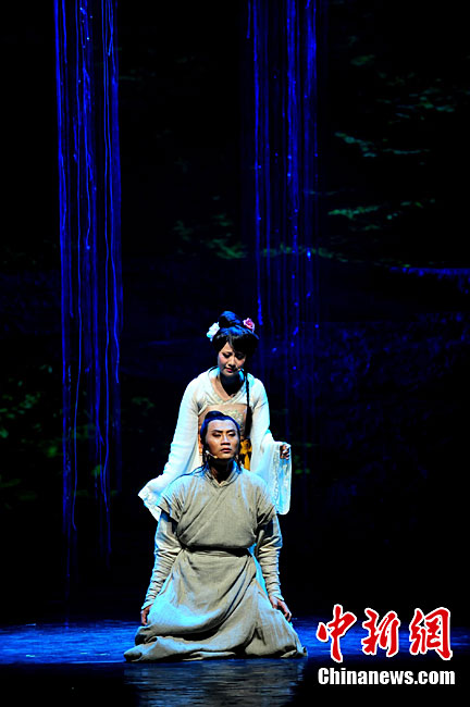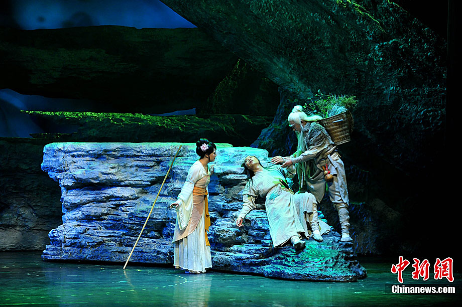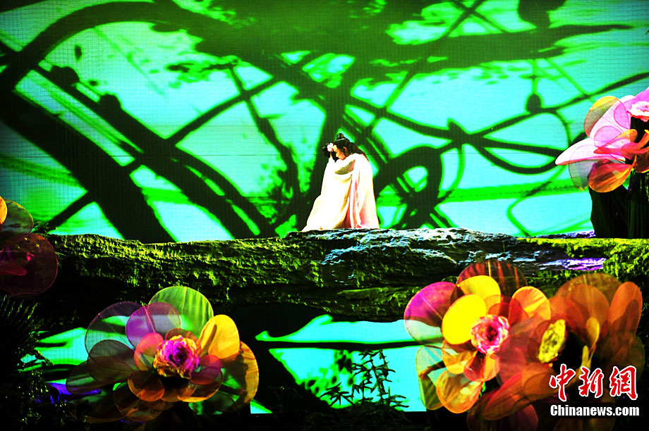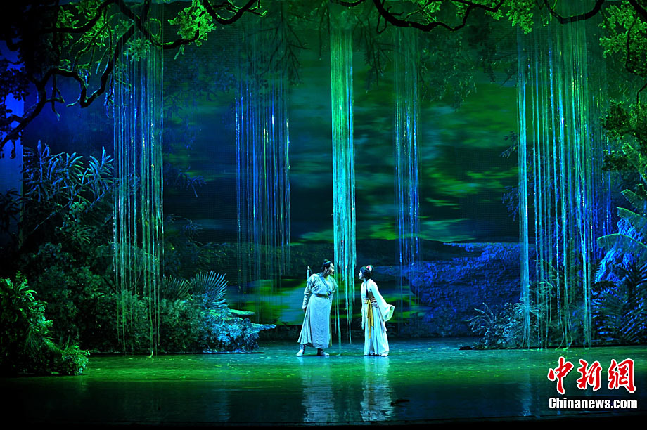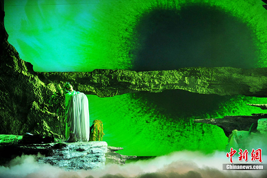 10月16日晚,匯集了中國內地頂級音樂劇創作團隊集體智慧的大型原創多媒體音樂劇《青城》在成都錦城藝術宮舉行全球首演。該劇以青城山傳統道教文化為精神內核,以成都市唯一的世界自然文化雙遺產地“青城山—都江堰”作為劇情發展“舞臺”,是全球“首部道文化多媒體音樂劇”,也是象征成都市都江堰災后文化重建、人性重建、精神重建的文化作品。圖為《青城》劇照。中新社發 安源 攝