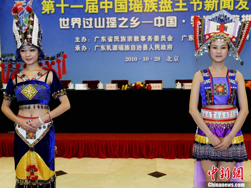 10月29日,第十一屆中國瑤族盤王節新聞發布會暨世界過山瑤之鄉——中國乳源旅游推介會在人民大會堂召開。本次會議發布,世界瑤族人民的盛會——第十一屆中國瑤族盤王節將于2010年11月20日至22日在廣東乳源瑤族自治縣隆重舉行。瑤族盤王節是瑤族人民紀念其始祖盤王(盤瓠)的盛大節日。圖為“瑤族公主”形象代表身著湘粵桂南嶺地區的瑤族盛裝亮相新聞發布會。中新社記者 劉震 攝