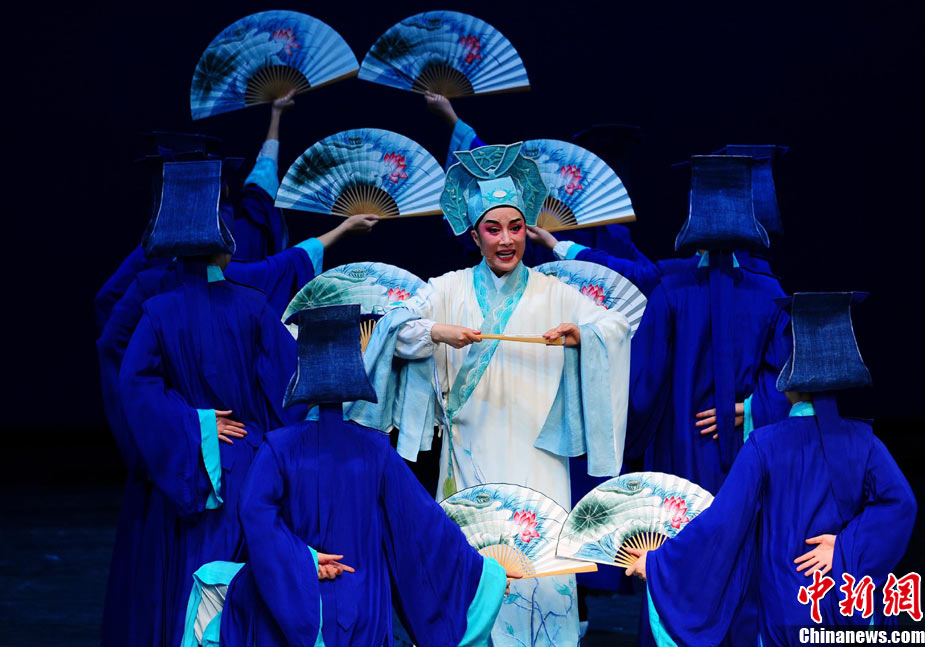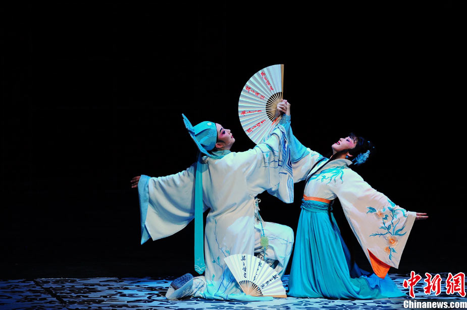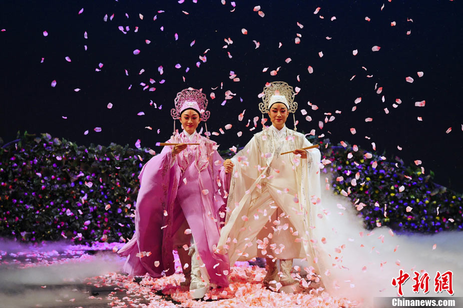 11月23日晚間,由浙江小百花越劇團帶來的新版越劇《梁山伯與祝英臺》在北京國家大劇院上演,著名越劇表演藝術家茅威濤等人的精彩演出再現了這出中國經典的凄美愛情故事。中新社記者 侯宇 攝