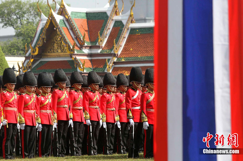 泰國皇家衛隊士兵著彩裝游行為國王慶生