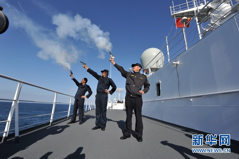海軍、海監、漁政部門人員共同發射信號彈。“東海協作—2012演習”軍地海上聯合維權演習正式開始。虞起正 攝