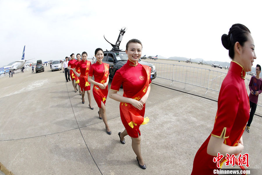2012年11月12日,2012珠海航展開幕前夕,禮儀小姐身著旗袍亮相機場,盡顯曲線美。圖片來源:東方IC 版權作品 請勿轉載