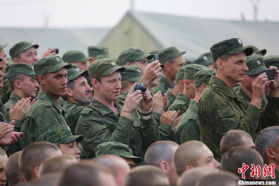 8月10日,隨同中方參演部隊赴俄羅斯參加“和平使命-2013”中俄聯演的沈陽軍區政治部文工團演員們,為中俄千余名參演官兵獻上了一場精彩的文藝晚會。豐富多彩的文藝節目,將位于切巴爾庫爾訓練場的中俄聯演野營村,變成了友誼的盛會、歡樂的海洋。 圖為精彩節目吸引俄國官兵。中新社發 李祥輝 攝