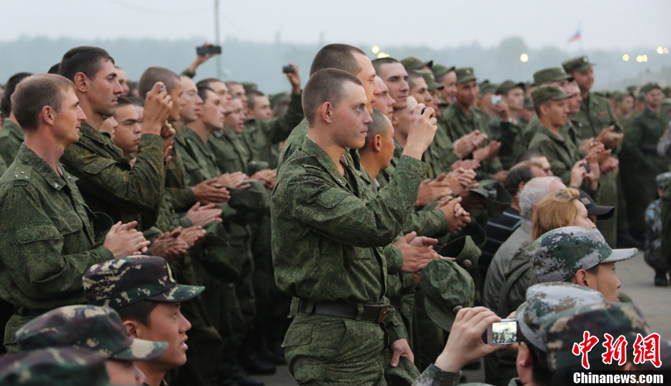 8月10日,隨同中方參演部隊赴俄羅斯參加“和平使命-2013”中俄聯演的沈陽軍區政治部文工團演員們,為中俄千余名參演官兵獻上了一場精彩的文藝晚會。豐富多彩的文藝節目,將位于切巴爾庫爾訓練場的中俄聯演野營村,變成了友誼的盛會、歡樂的海洋。圖為精彩節目吸引俄國官兵。中新社發 李祥輝 攝