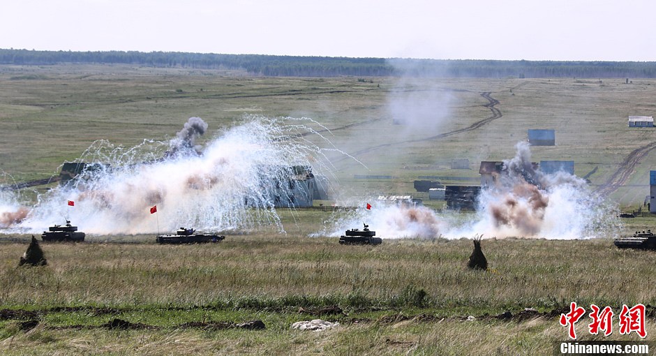 8月12日,“和平使命-2013”聯合反恐軍演中俄兩軍參演部隊在切巴爾庫爾合同訓練場舉行全員全要素實兵協同訓練。雙方共出動官兵近900人,坦克、步戰車、直升機等武器裝備約130臺,雙方導演部總導演——俄中部軍區司令員波格諾夫斯基和沈陽軍區副司令員石香元,共同到演習地觀摩并指導兩軍訓練。圖為中方坦克戰車對恐怖武裝力量實施火力打擊。中新社發 李祥輝 攝