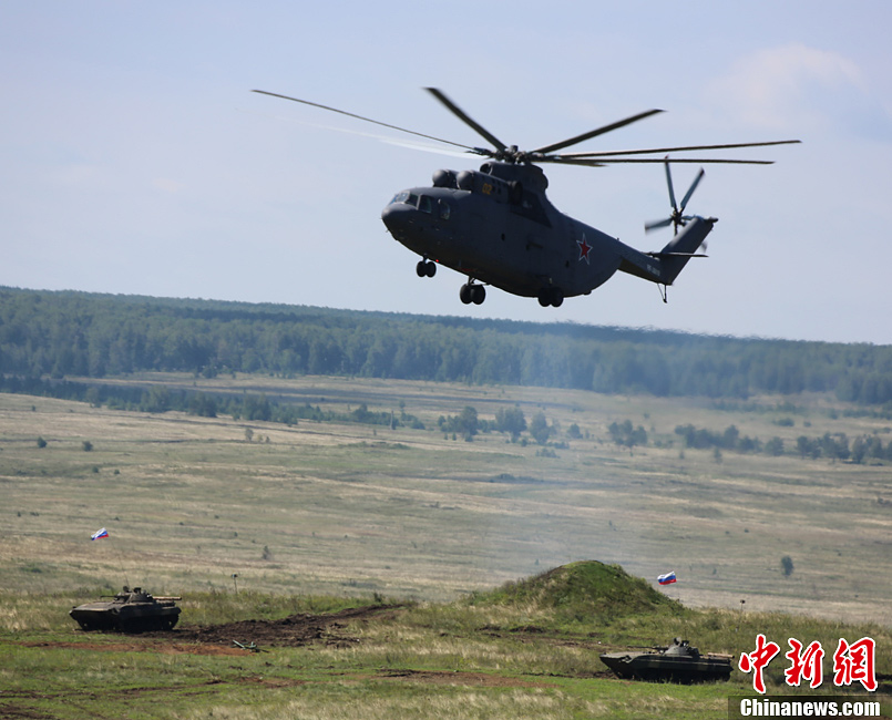 8月12日,“和平使命-2013”聯(lián)合反恐軍演中俄兩軍參演部隊在切巴爾庫爾合同訓(xùn)練場舉行全員全要素實兵協(xié)同訓(xùn)練。雙方共出動官兵近900人,坦克、步戰(zhàn)車、直升機(jī)等武器裝備約130臺,雙方導(dǎo)演部總導(dǎo)演——俄中部軍區(qū)司令員波格諾夫斯基和沈陽軍區(qū)副司令員石香元,共同到演習(xí)地觀摩并指導(dǎo)兩軍訓(xùn)練。中新社發(fā) 李祥輝 攝