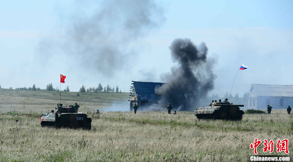 8月12日12時(shí)(北京時(shí)間下午2時(shí)),“和平使命-2013”中俄聯(lián)合反恐軍事演習(xí),在俄羅斯切巴爾庫爾合同訓(xùn)練場進(jìn)行了實(shí)兵實(shí)彈協(xié)同訓(xùn)練。圖為中俄雙方參演官兵共同向前推進(jìn)清剿殘敵。中新社發(fā) 譚長俊 攝