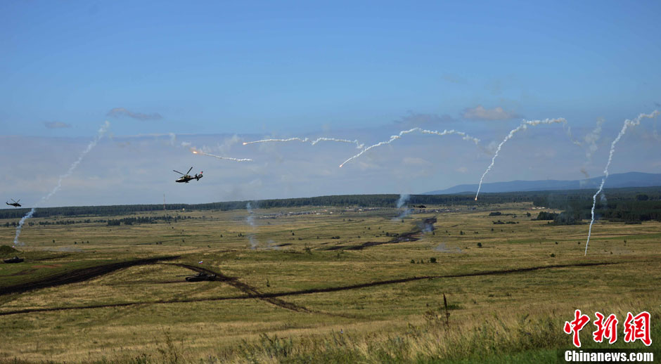 8月12日12時(北京時間下午2時),“和平使命-2013”中俄聯合反恐軍事演習,在俄羅斯切巴爾庫爾合同訓練場進行了實兵實彈協同訓練。圖為中方裝甲戰車發起攻擊前實施干擾。中新社發 譚長俊 攝
