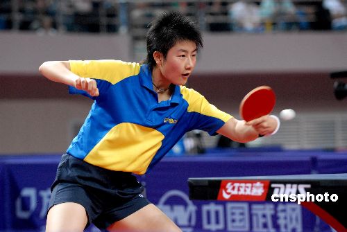 2007年10月26日,第六屆全國城市運(yùn)動(dòng)會(huì)乒乓球女子單打決賽在武漢洪山體育館舉行。繼半決賽擊敗世乒賽女單冠軍郭躍后,成都市代表隊(duì)小將丁寧奮力拼博,又以4:2力克另一名世界名將、濟(jì)南市代表隊(duì)的李曉霞,獲乒乓球女子單打冠軍,摘取了“六城會(huì)”女子乒乓球單打決賽金牌。中新社發(fā) 楚天行 攝