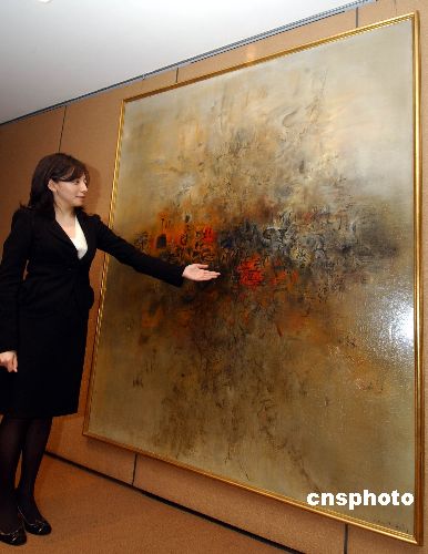 圖為趙無(wú)極作品《大地?zé)o形》,運(yùn)用了原始的五種顏色分別隱喻樹(shù)木,太陽(yáng),大地,及晝夜,巧妙地把文字、形像與構(gòu)圖完全融合一體,估價(jià)2,000萬(wàn)港元,預(yù)料將打破趙無(wú)極作品世界拍賣(mài)紀(jì)錄。