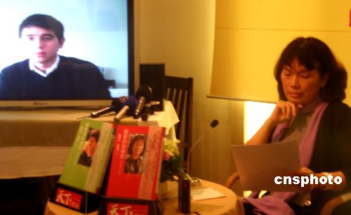 臺(tái)灣作家龍應(yīng)臺(tái)與長(zhǎng)子安德烈(圖左)的三十六封家書(shū)在臺(tái)北輯錄出版。圖為在香港大學(xué)就讀經(jīng)濟(jì)系、有德國(guó)血統(tǒng)的安德烈,以視訊方式參與十一月七日下午于臺(tái)北舉辦的一場(chǎng)茶會(huì)。龍應(yīng)臺(tái)表示,兩代人之間也要尋找方法,開(kāi)一扇溝通之門(mén)。中新社發(fā) 劉舒凌 攝