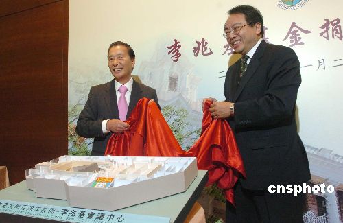 11月22日,香港恒基兆業(yè)地產(chǎn)有限公司主席李兆基博士捐贈(zèng)五億港元予香港大學(xué),以促進(jìn)港大未來的發(fā)展計(jì)劃,會(huì)上李兆基博士(左)與香港大學(xué)校長徐立之教授為“香港大學(xué)百周年校園---李兆基會(huì)議中心”模型舉行揭幕儀式,新校園計(jì)劃于2011至2012年落成。中新社發(fā) 鄧慶樂 攝