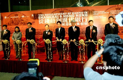 “從錢莊到現(xiàn)代銀行-滬港銀行業(yè)發(fā)展”展覽,十一月二十七日在香港歷史博物館開幕,行政長官曾蔭權(quán)(左4)、中央駐港聯(lián)絡(luò)辦公室副主任郭莉(右4)、中國工商銀行股份有限公司董事長姜建清(左3)、香港金融管理局總裁任志剛(右3)、特區(qū)民政事務(wù)局常任秘書長尤曾家麗、工商銀行上海分行行長孫持平(右2)、康樂及文化事務(wù)署署長周達(dá)明(左1)、工商銀行(亞洲)有限公司董事總經(jīng)理朱琦為活動剪彩。中新社發(fā) 王麗南 攝
