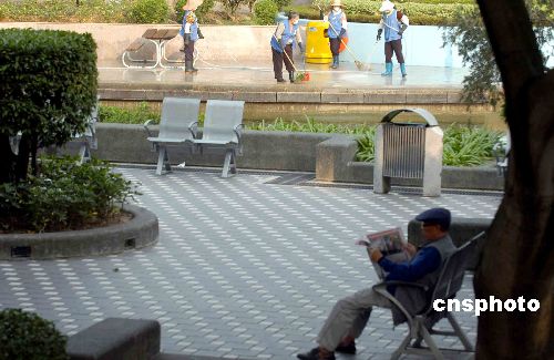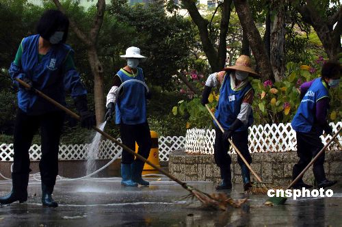12月7日早上,香港康文署人員在屯門公園以清水開釋消毒藥水清洗場(chǎng)地。半個(gè)月內(nèi),屯門公園在同一地點(diǎn)發(fā)現(xiàn)有雀鳥確診或懷疑帶有禽流感病毒。中新社發(fā) 譚達(dá)明 攝