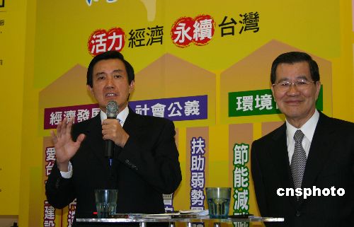 十二月十九日,國民黨二00八參選人馬英九及其搭檔蕭萬長聯(lián)合發(fā)布了《臺灣經(jīng)濟新藍圖之二·產(chǎn)業(yè)再造及全球連結(jié)報告》。中新社發(fā) 陳國華 攝