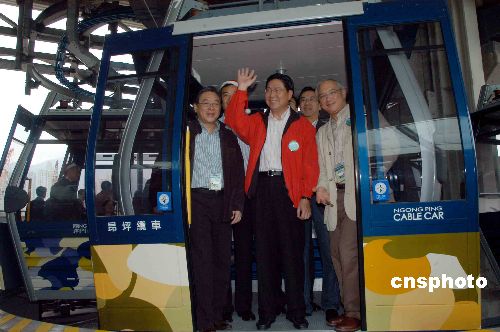 12月22日,香港商務(wù)及經(jīng)濟(jì)發(fā)展局局長馬時亨(中)早上試坐昂坪360纜車,馬贊賞纜車有改善,又說坐得很放心,呼吁市民及游客都應(yīng)該來坐纜車。中新社發(fā) 譚達(dá)明 攝