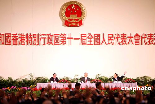 1月3日,第十一屆港區全國人大代表選舉會議,在灣仔會展中心舉行第一次全體會議,選出15名主席團成員,行政長官曾蔭權任主席團常務主席。中新社發 洪少葵 攝