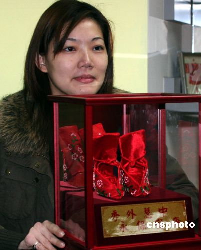 一月三日,一個名為“絕代三寸,風華金蓮”——臺灣人與三寸金蓮的展覽在臺灣故事館展出。目的在于讓民眾通過了解三寸金蓮鞋產生的歷史和演變,進而了解曾流行于大陸和臺灣的纏足文化。展覽共展出由臺北縣土城廣川醫院院長,也是三寸金蓮文物館館長的柯基生收集的三寸金蓮鞋真品四十六件。圖為工作人員正在向觀眾展示臺灣婦女曾穿過的三寸金蓮鞋。中新社發 陳立宇 攝