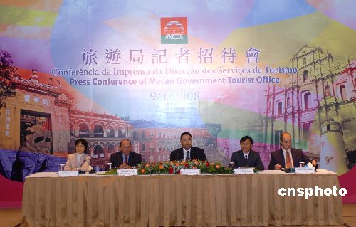 一月九日,崔世安(中)出席澳門旅游局在漁人碼頭舉行的記者招待會并答記者問。當日,澳門旅游局公布﹐2007年澳門入境旅客超過2700萬人次,增幅為22.7%。中國內地仍是最大市場,約占整體旅客的55%,其中48%為“個人游”旅客,其次是香港、臺灣旅客。中新社發 史利 攝