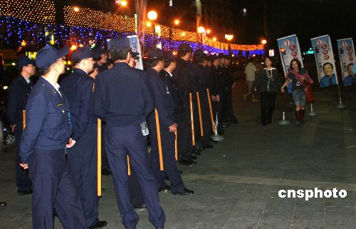 圖為十一日晚警察在候選人造勢(shì)的現(xiàn)場(chǎng)附近戒備。中新社發(fā) 陳立宇 攝