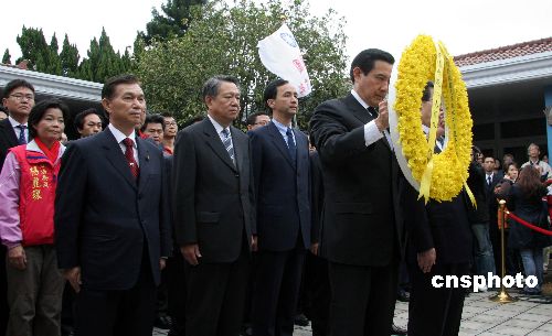 一月十三日,蔣經國逝世二十周年,在桃園縣長朱立倫等人陪同下,中國國民黨二00八年臺灣“大選”參選人馬英九和參選搭檔蕭萬長,專程到桃園縣頭寮的蔣經國陵寢拜謁。中新社發 孫自法 攝