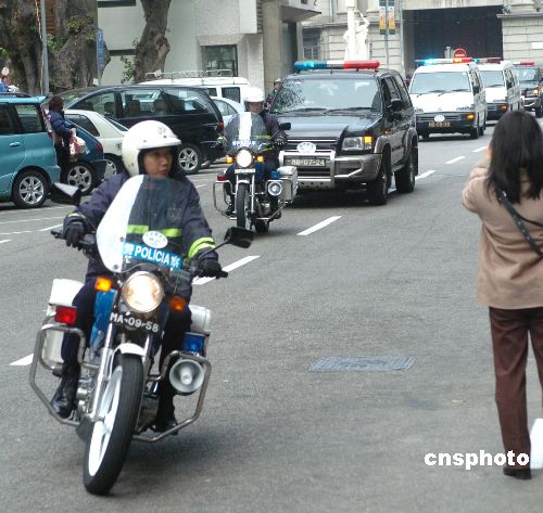 押解歐文龍親屬的囚車(chē)(白色)在警察的護(hù)衛(wèi)下駛?cè)氚拈T(mén)初級(jí)法院。