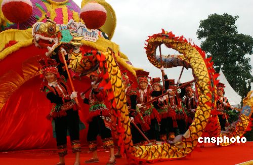 一月三十一日,穿上傳統(tǒng)民族服式、來自云南的女子舞龍隊在香港海洋公園演繹金龍獻(xiàn)瑞,向游客及市民拜年。當(dāng)日,香港海洋公園公布在農(nóng)歷新年期間,將推出冰上百老匯、金銀滿冰宮、女子舞龍大匯演、醒獅賀歲等八十八個新春熱點。中新社發(fā) 蔡蔓莉 攝