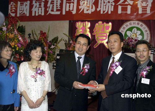 中國(guó)南方罕見雪災(zāi)牽動(dòng)在美福建僑胞的心。借當(dāng)?shù)貢r(shí)間3日美國(guó)福建同鄉(xiāng)聯(lián)合會(huì)成立周年慶典,在美謀生的福建鄉(xiāng)親發(fā)起捐款賑災(zāi)活動(dòng),短短一個(gè)小時(shí)內(nèi),募得一萬二千五百余美元。圖為福建同鄉(xiāng)聯(lián)合會(huì)會(huì)長(zhǎng)陳榮華(右二)委托中國(guó)駐美大使館公使劉光源(中)將捐款轉(zhuǎn)交給祖國(guó)災(zāi)區(qū)人民,劉光源代表災(zāi)區(qū)人民表示感謝。中新社發(fā) 邱江波 攝