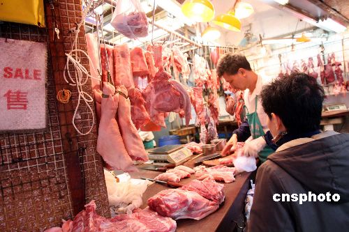 二月五日,香港市民在街市購買新鮮豬肉準備過年。日前,內地大雪阻交通,一度引發供港食品短缺,連日來已得以紓緩。中新社發 洪少葵 攝