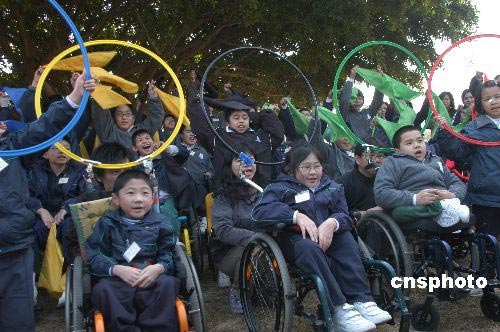 二月二十日是北京零八傷殘奧運會倒數二百天,香港不少特殊學校學生參加在彭福公園舉行的“北京二零零八年殘奧會二百天倒數“儀式。中新社發 譚達明 攝