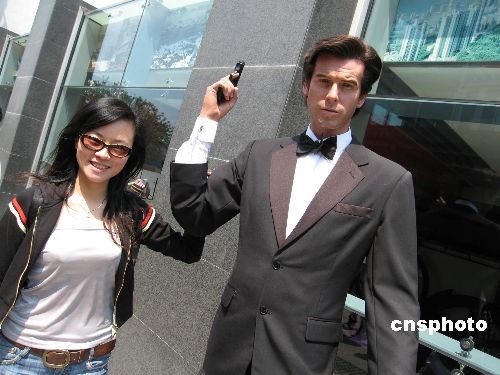 近日,香港進入春夏旅游旺季,訪港旅客接踵而來。圖為一名游客在太平山景區(qū)與007電影主角皮爾斯·布魯斯南的蠟像合影。中新社發(fā) 洪少葵 攝