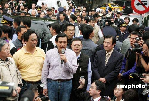 三月二十二日,二00八臺灣地區領導人選舉投票。中國國民黨候選人馬英九在臺北一個投開票所投票后,接受眾多媒體的采訪。中新社發 黃少華 攝