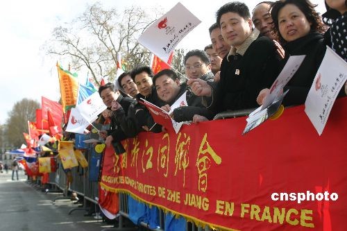 法國當地時間4月7日中午,北京奧運圣火在“浪漫之都”巴黎傳遞在巴黎的地標埃菲爾鐵塔拉開帷幕。圖為法國巴黎當地華人華僑在埃菲爾鐵塔下迎接奧運圣火。 沈晨 攝