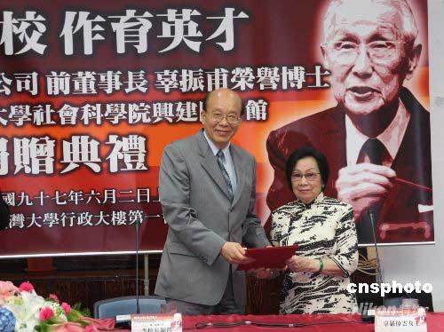六月二日,辜振甫的遺孀辜嚴倬云替他完成遺愿,捐贈臺灣大學社會科學院興建圖書館。圖為臺灣大學校長李嗣涔向辜嚴倬云致贈感謝狀。中新社發 耿軍 攝