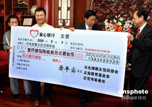 6月6日,臺灣佛教正覺同修會、正覺教育基金會、正覺寺籌備處等在北京國家宗教事物局向四川地震災(zāi)區(qū)捐獻(xiàn)1863萬元新臺幣,以幫助四川災(zāi)區(qū)受傷人員、學(xué)校重建、寺廟修繕等。圖為捐贈儀式上,臺灣佛教正覺同修會董事長張公仆先生(左二),向國家宗教事物局副局長蔣永堅(jiān)(右二)遞交支票樣本。中新社發(fā) 宋吉河 攝