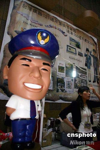 一座“臺灣鐵路公仔”亮相臺北火車站,吸引路人。