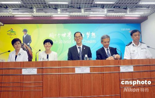 九月二日,香港特區政府就北京二零零八年殘奧馬術比賽項目的準備工作舉行記者會,香港民政事務局局長曾德成、奧運馬術公司行政總裁林煥光、香港殘疾人奧委會暨傷殘人士體育協會主席馮馬潔嫻、運輸署助理署長(新界)羅鳳屏和警察公共關系科總警司吳家聲向媒體公布相關事宜。中新社發 鄧慶樂 攝