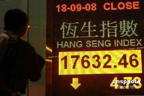 九月十八日,香港恒生指數(shù)收市報一萬七千六百三十二點四六點,跌四點七三點,全日波幅高達一千五百點。中新社發(fā) 武仲林 攝