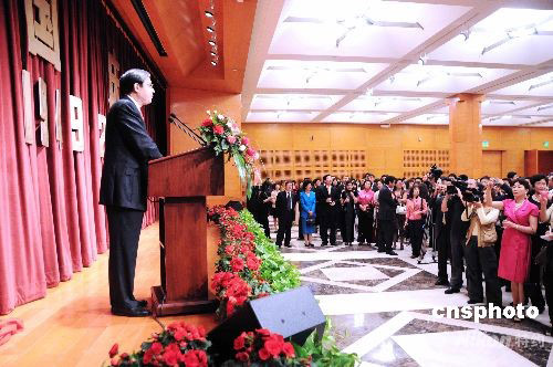 中國駐美大使周文重大使美東時間九月二十八日晚在駐美大使館新館舉行華僑華人國慶招待會。圖為周文重在大使館新館國慶招待會上致辭。中新社發 邱江波 攝