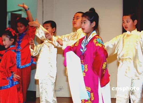 十月一日,參加“2008·陽光海峽”兩岸快樂小天使活動營的福建快樂小天使走進臺北木柵小學與在校小朋友進行交流和聯歡。圖為福建快樂小天使為臺北木柵小學師生獻上精彩的京劇表演,博得喝彩。中新社發 劉可耕 攝