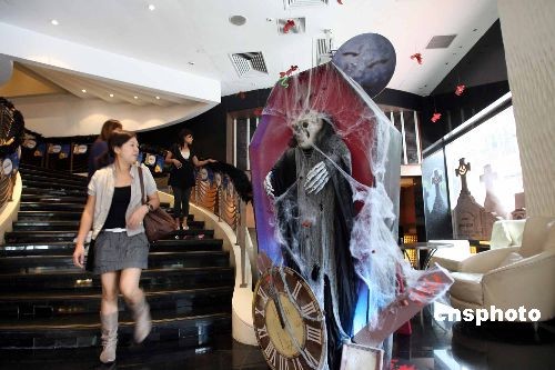 一年一度的萬圣節即將到來,在香港鬧市街頭甚至酒店商場,到處可見擺設中西文化交匯的趣怪裝飾,商家借西方節日,營造熱鬧氣氛,招徠顧客。中新社發 洪少葵 攝