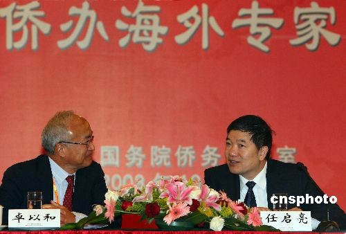 10月27日,第二屆國務(wù)院僑辦海外專家咨詢委員會會議在北京舉行。圖為國務(wù)院僑務(wù)辦公室副主任任啟亮(右)與華裔美籍電機工程學(xué)家卓以和(左)在會上交流。中新社發(fā) 廖文靜 攝