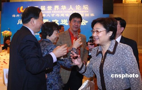 10月29日晚,第五屆世界華人論壇在北京閉幕。國務院僑辦主任李海峰出席歡送宴會并向參會代表們敬酒致意。中新社發 廖文靜 攝