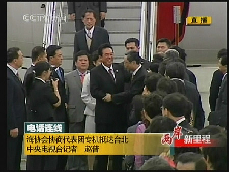 海峽兩岸關系協會會長陳云林率海協會協商代表團,3日上午11時46分許乘國航包機抵達桃園機場,展開在臺灣的歷史性訪問行程。